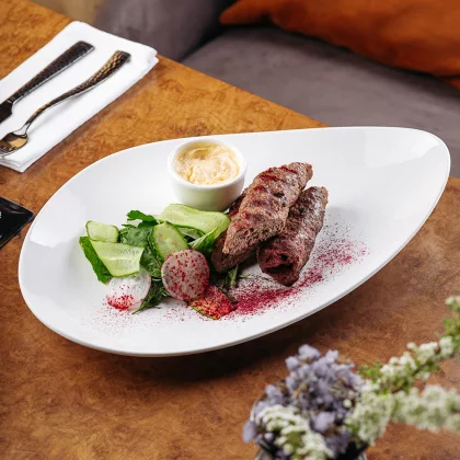 Люля-кебаб из говядины приготовленный на углях с добавлением свиного фарша (не более 30%), говяжьего жира, кинзы, мяты и пряных трав. Подается с сырным соусом чеддер. Украшается зеленью.