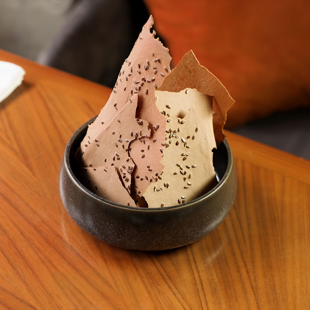 Паштет из куриной печени, лука, моркови, стебля сельдерея, сливочное масло, сливки, соль, перец, тимьян, коньяк, красное вино и свекольный фреш) при подаче декорируется кондитерским велюром черного цвета и чипсами из квасного сусла в виде березовой коры (мука, вода, винный уксус, квасное сусло, соль).